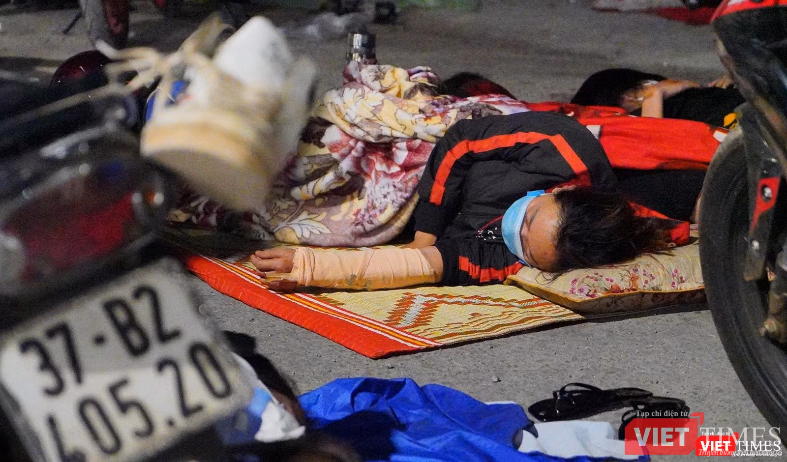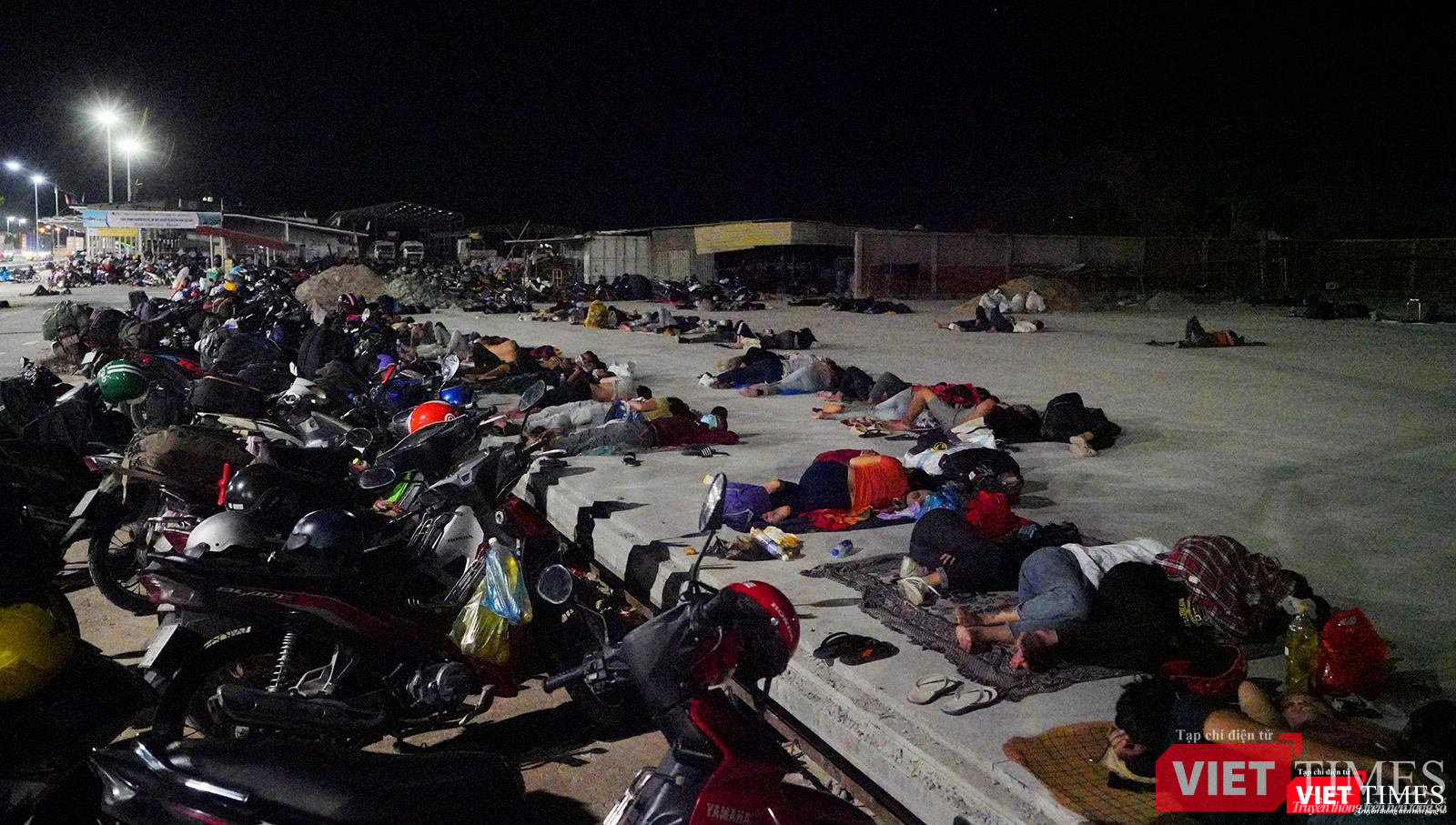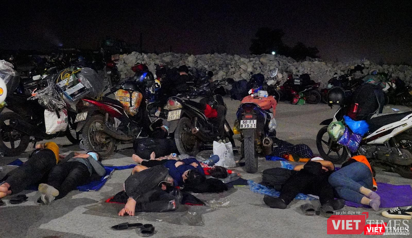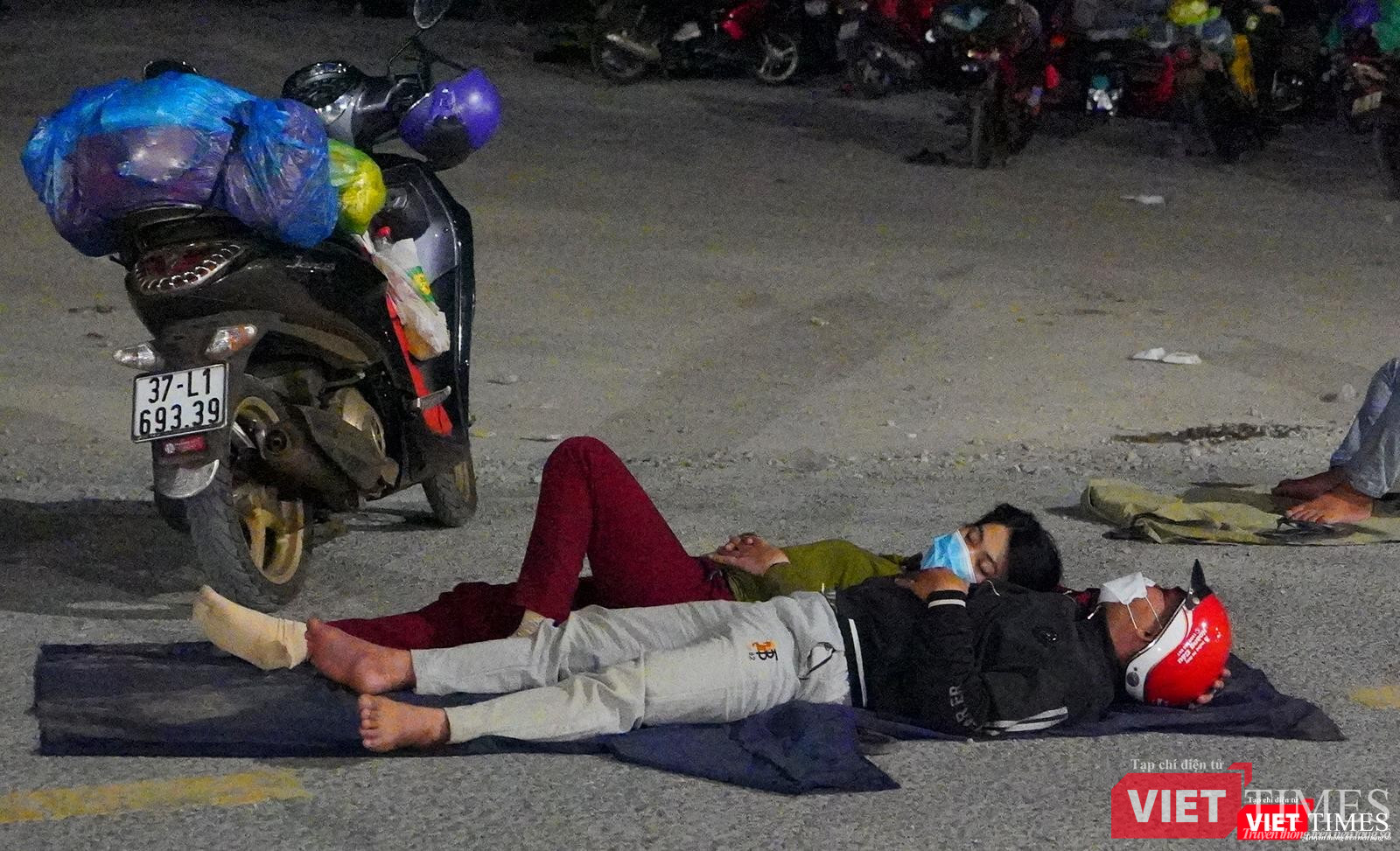 Trong lúc đội tình nguyện bảo dưỡng xe thì người dân tranh thủ ngã giấc sau hành trình dài từ TP HCM về quê