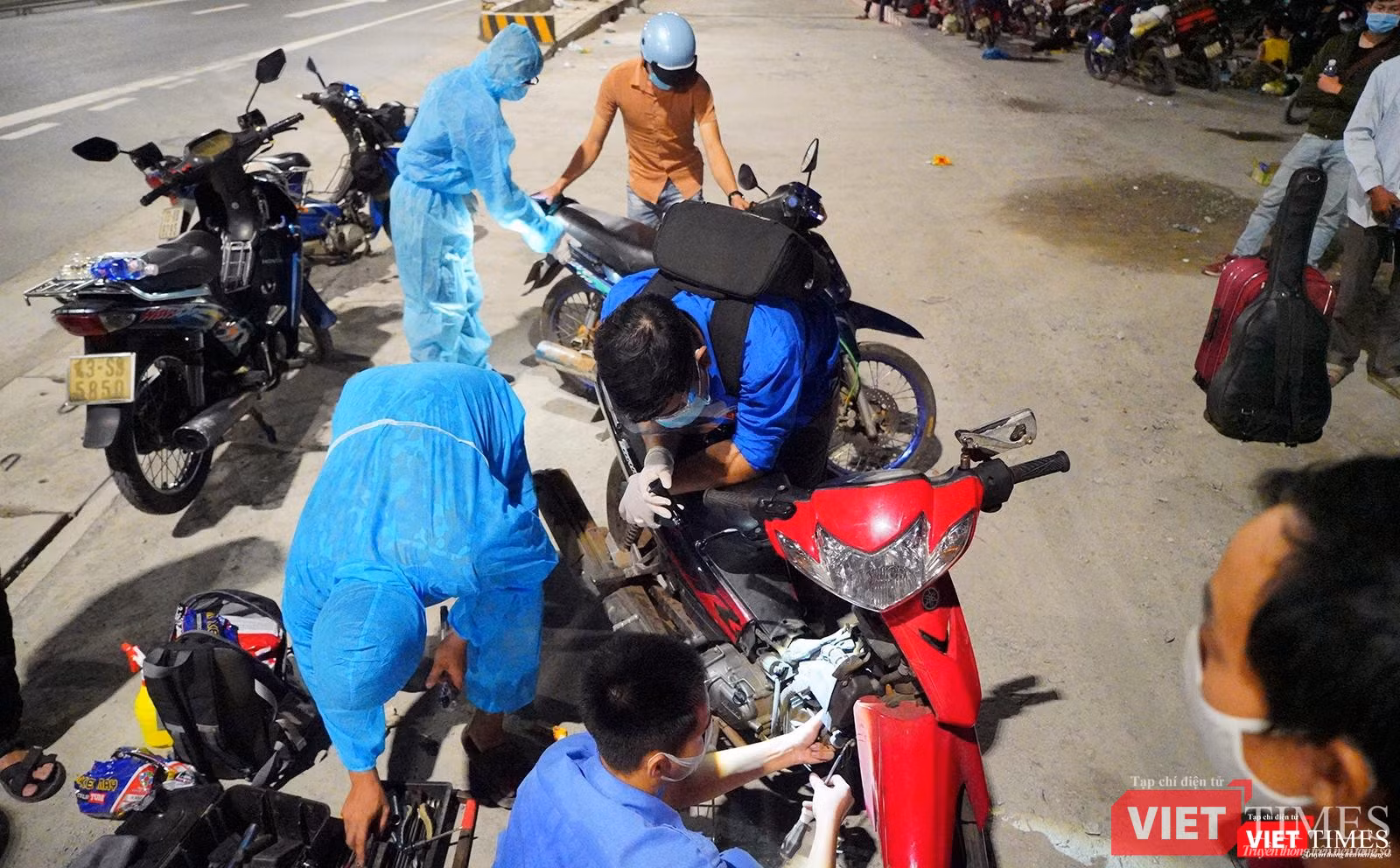 Một số hình ảnh của đội SOS sinh viên hỗ trợ đón, sửa chữa xe máy cho người dân hành trình từ TP HCM về quê đi qua địa phận TP Đà Nẵng (ảnh Phát Lê):
