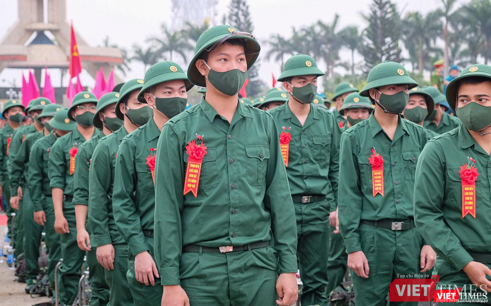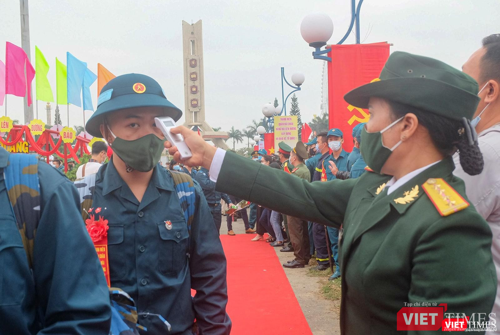 Tất cả tân binh được đo nhiệt độ trước khi đi về đơn vị