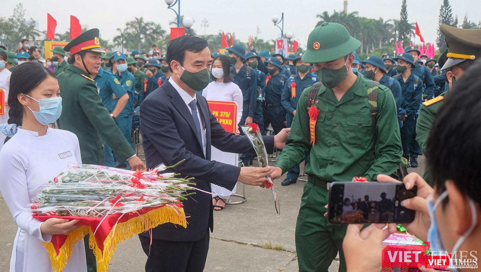 Chủ tịch UBND TP Đà Nẵng Lê Trung Chinh tặng hoa cho tân binh trong ngày tuyển quân năm 2021