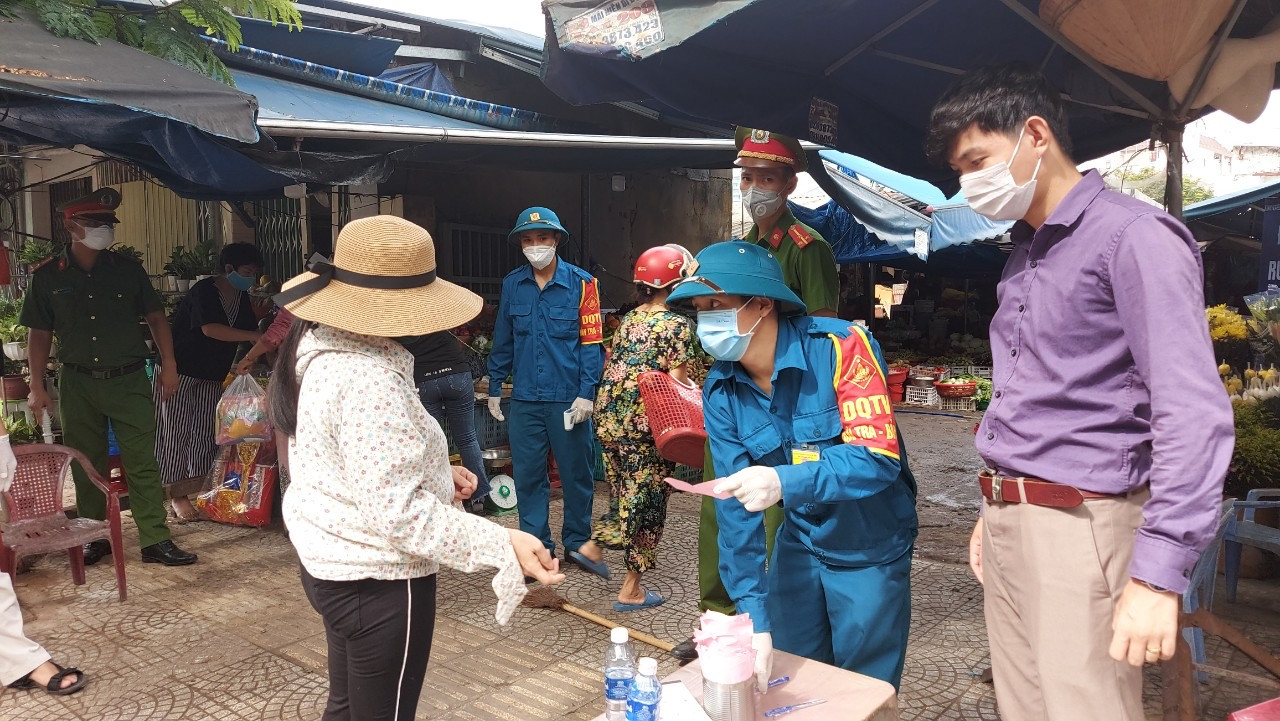 | Hướng dẫn người dân tuân thủ quy định giãn cách xã hội khi đi vào chợ |