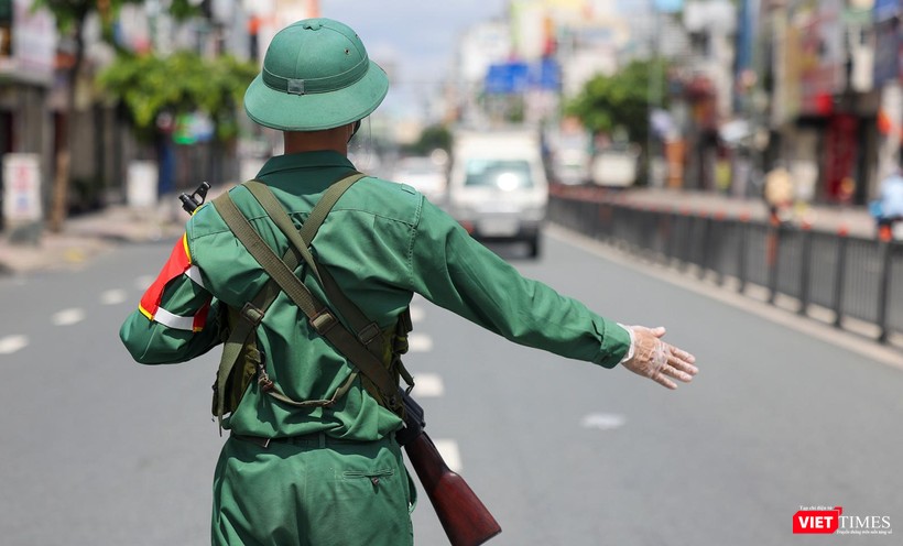 Ghi nhận tại các tuyến đường trên địa bàn TP HCM vắng vẻ hơn rất nhiều so với những ngày trước. Tại các chốt kiểm soát, bên cạnh lực lượng CSGT, cảnh sát trật tự, đã xuất hiện lực lượng quân đội có vũ trang cùng làm nhiệm vụ.