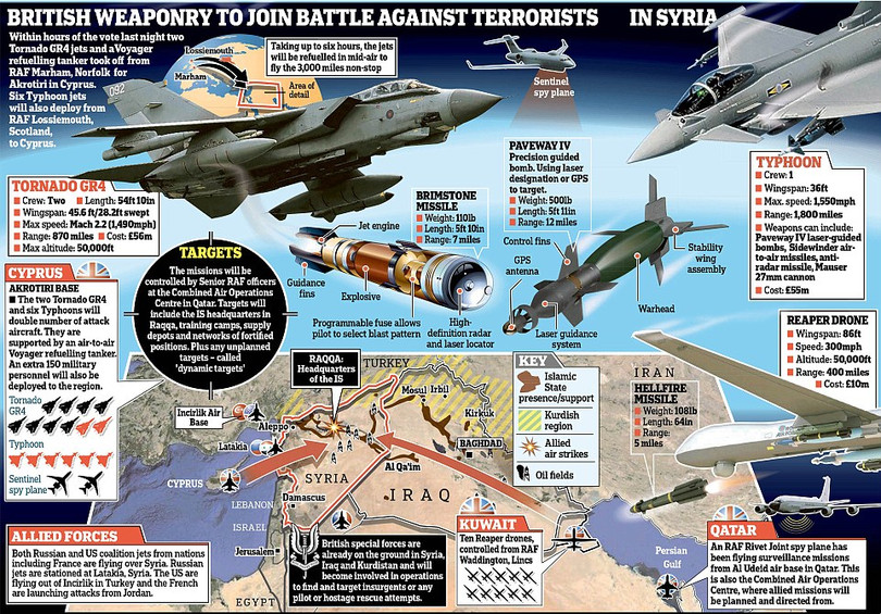 Trong bài phát biểu trước quốc hội, Thủ tướng Cameron nói rằng những máy bay Tornado GR4 với độ chính xác cao, được trang bị tên lửa có laser dẫn đường sẽ "tạo nên sự khác biệt lớn" khi không kích vào Raqqa - thủ phủ tự phong của IS tại Syria và các cơ sở buôn bán dầu của IS.