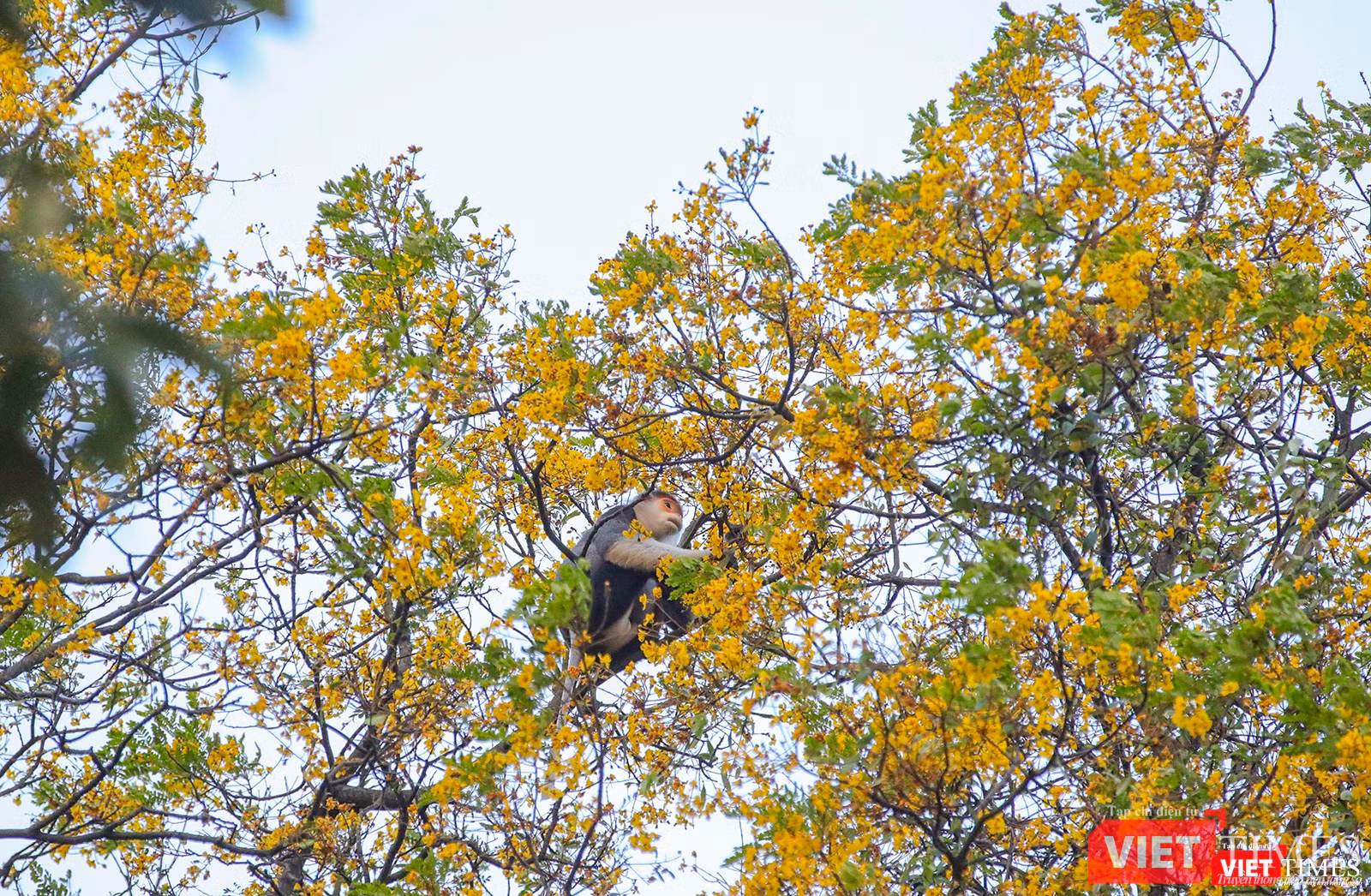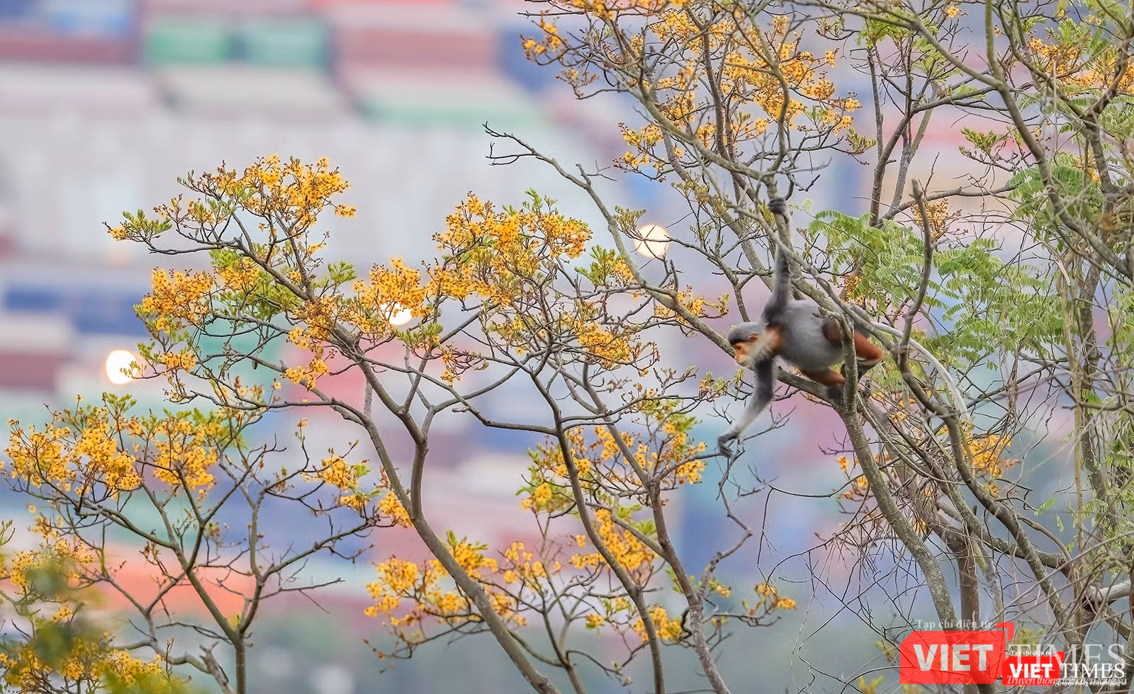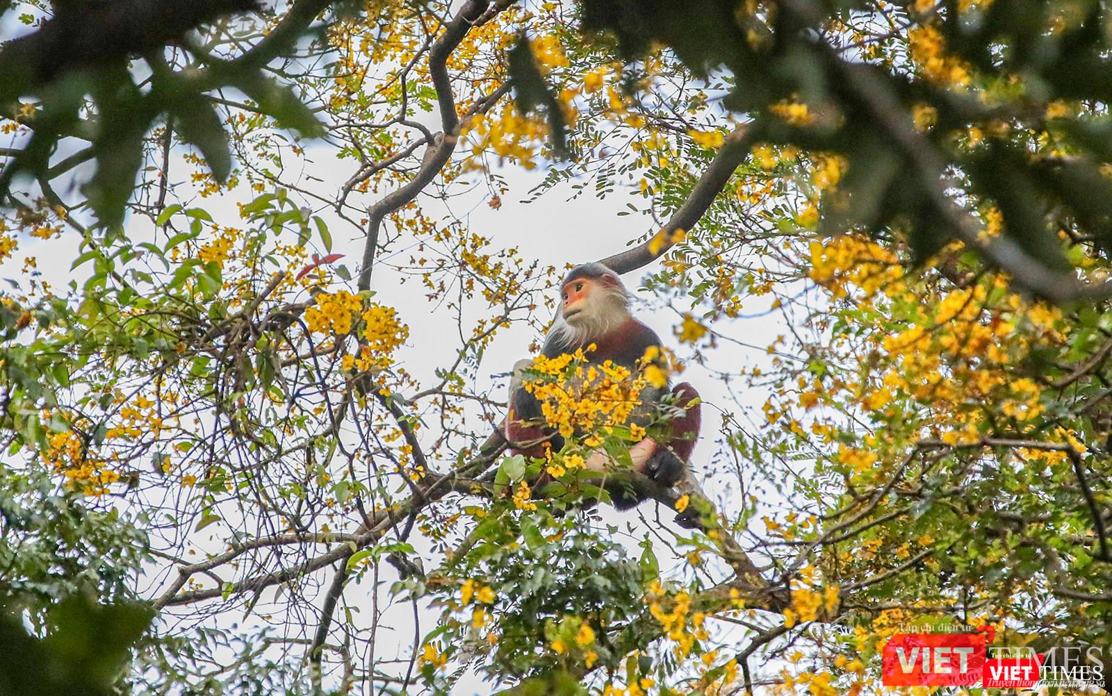 Voọc chà vá chân nâu bên những bông hoa lim xẹt vàng rực cả một góc rừng Sơn Trà.
