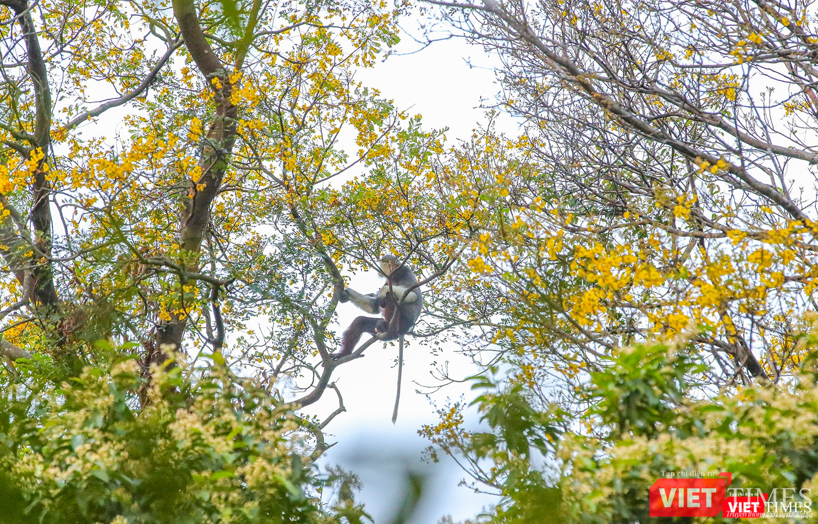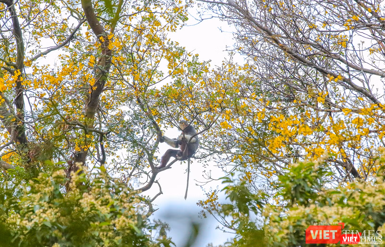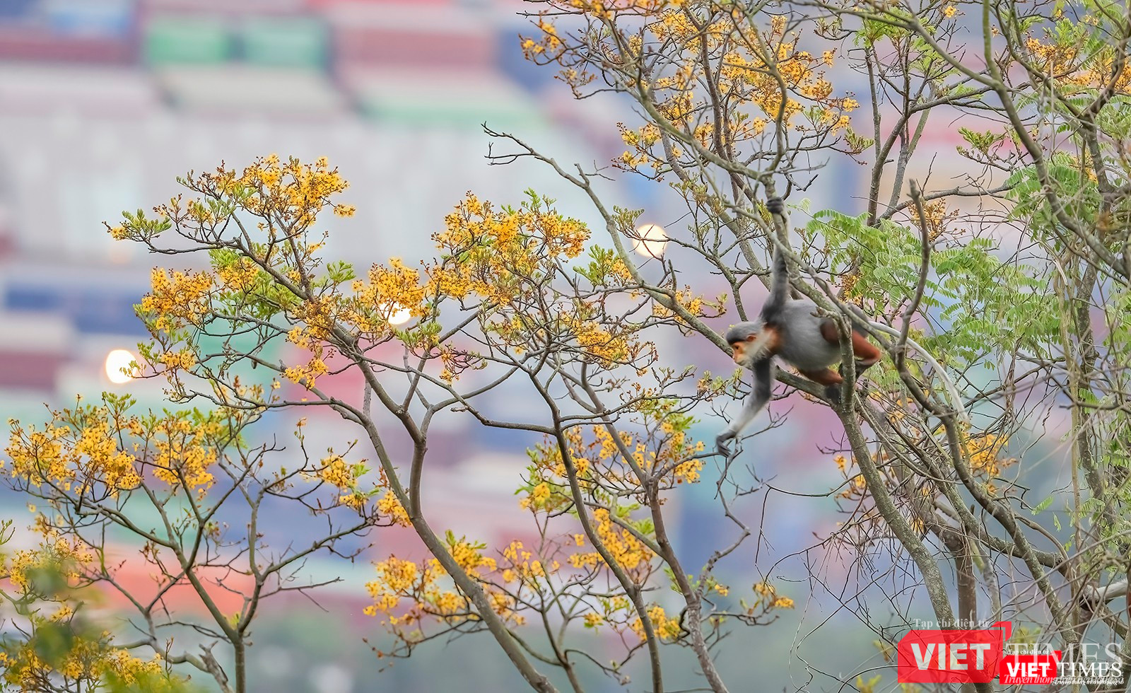 Voọc chà vá chân nâu bên những bông hoa lim xẹt vàng rực cả một góc rừng Sơn Trà.