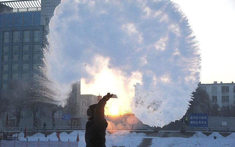 Nước nóng đóng băng ngay sau đước hắt lên trên không khi nhiệt độ giảm xuống dưới -30 độ C tại thành phố Cáp Nhĩ Tân, Trung Quốc.