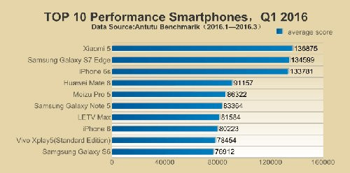 Bất ngờ nhất khi chiếc Xiaomi Mi 5 ở vị trí cao nhất với điểm số sức mạnh là 136.875 điểm, đứng thứ 2 là Galaxy S7 Edge với điểm số 134.599 điểm và đứng thứ 3 là iPhone 6s với điểm số 133.781 điểm. Đáng tiếc khi LG G5 sở hữu cấu hình rất mạnh lại chưa được cập nhật trong bảng xếp hạng này của AnTuTu.