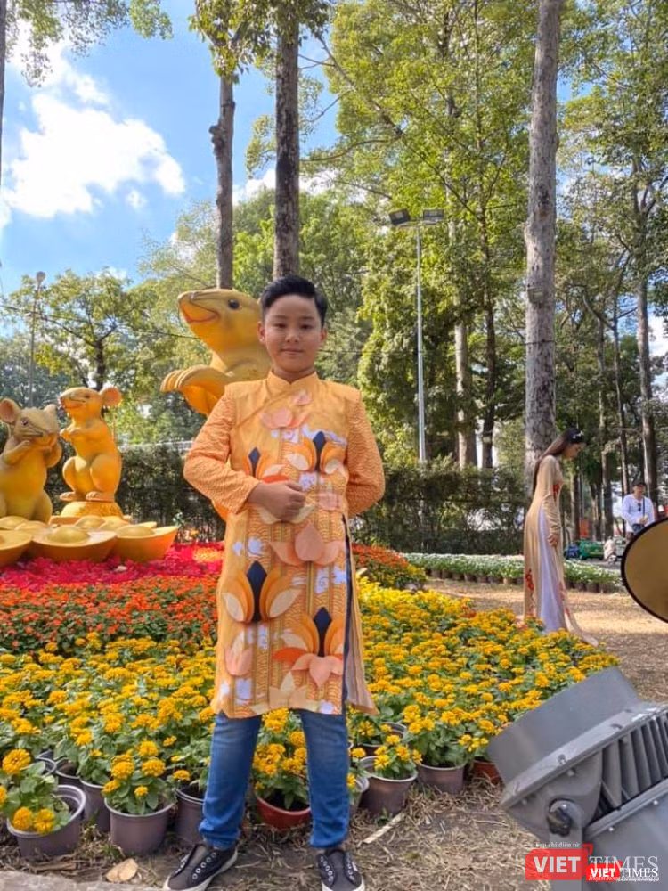 Mẫu nhí Đại sứ áo dài Việt Nam Gia Huy, Minh Anh diện áo dài của NTK Việt Hùng xúng xính đi chơi Tết giữa hội hoa xuân, chụp hình cùng các biểu tượng may mắn, phúc lộc từ chú chuột vàng Canh Tý 2020.