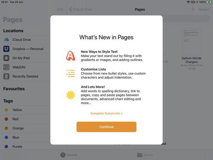 Riêng iWork trên iOS sẽ được tăng cường thêm hàng loạt tính năng mới liên quan đến bút cảm ứng Apple Pencil, bao gồm cả tùy chọn kích hoạt giữa tích năng vẽ, chọn đối tượng hoặc cuộn trang. Nếu chạm nhẹ 2 lần vào Apple Pencil thế hệ mới (thứ hai), người dùng có thể chuyển nhanh giữa những chế độ này. Người dùng cũng có thể bổ sung thêm các từ mới vào thư viện đánh vần (Spelling) của ứng dụng; và thay đổi cách viền bảng biểu nếu muốn.