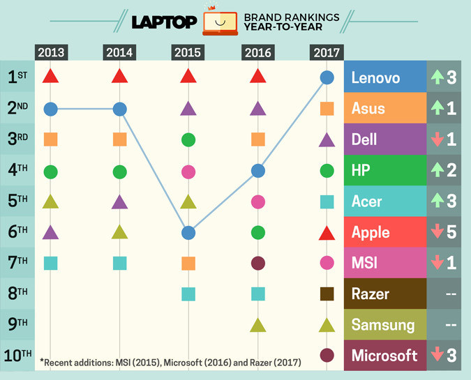Trong thống kê các laptop tốt nhất và tệ nhất năm 2017 của LaptopMag, Apple không còn là thương hiệu số 1 về laptop. Hãng hiện đã tụt xuống vị trí thứ 5 trên bảng xếp hạng.
