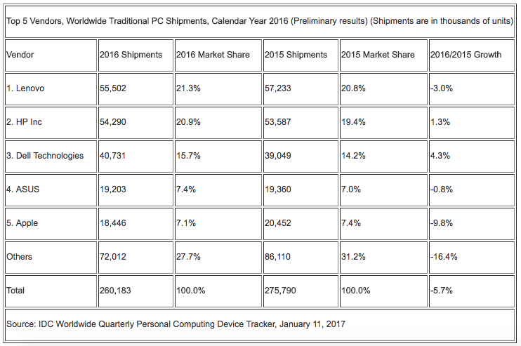 Nhìn chung, năm 2016 đánh dấu năm thứ năm liên tiếp suy giảm trong ngành công nghiệp máy tính tổng thể, với mức giảm chung là. Hai nhà sản xuất khác là Lenovo và ASUS cũng có sự sụt giảm tương ứng là 3% và 0,8%.