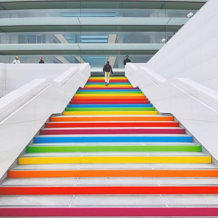 Những mảng màu sắc cầu vồng còn được trang trí tại một số cầu thang và lối đi bên trong khuôn viên tòa nhà. Màu sắc này gợi nhớ đến logo Apple sử dụng từ năm 1977, định hình quả táo cắn dở được sử dụng đến ngày nay.
