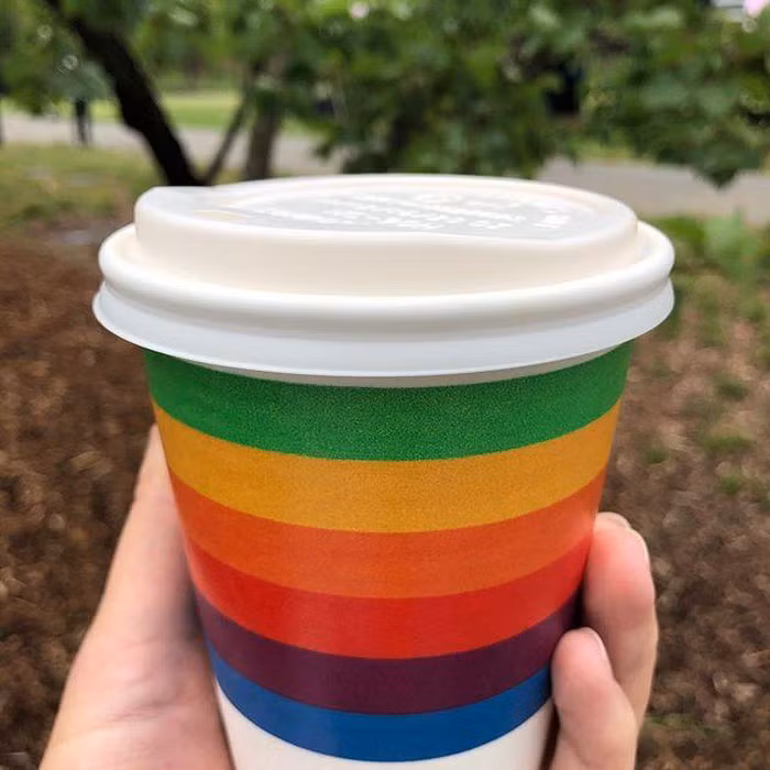Tách cà phê tại khu vực Caffè Macs dành cho nhân viên cũng được trang trí màu sắc vui vẻ này. Sân khấu và cách trang trí cầu vồng ở nhiều khu vực là ý tưởng thiết kế của chính Jony Ive, "kiến trúc sư trưởng" tại Apple.