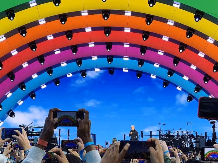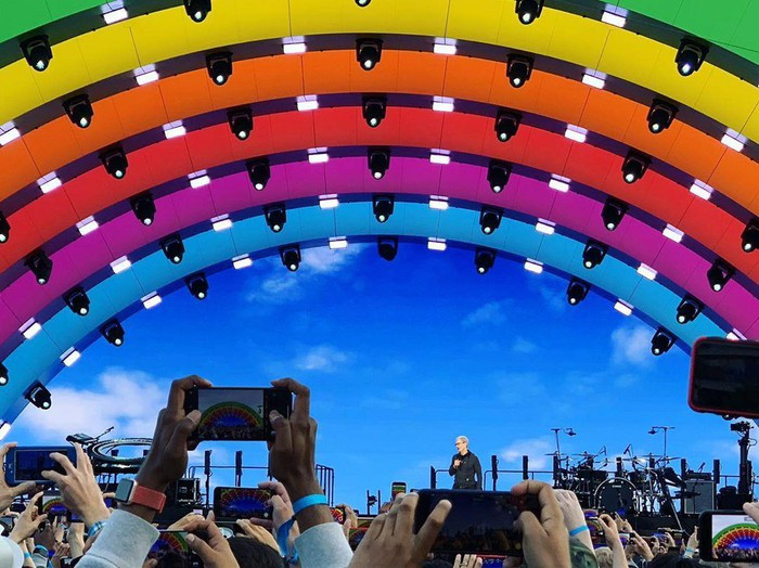 Pháo hoa cũng được sử dụng trong buổi trình diễn đầy âm thanh và màu sắc này. Hàng nghìn nhân viên Apple đã hòa vào âm nhạc sôi động và vũ điệu cuồng nhiệt của các nghệ sĩ trên sân khấu.