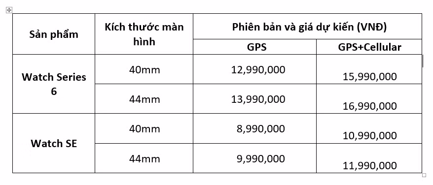 | Sản phẩm | Kích thước màn hình | Phiên bản | Dung lượng | Giá bán dự kiến (VNĐ) |
