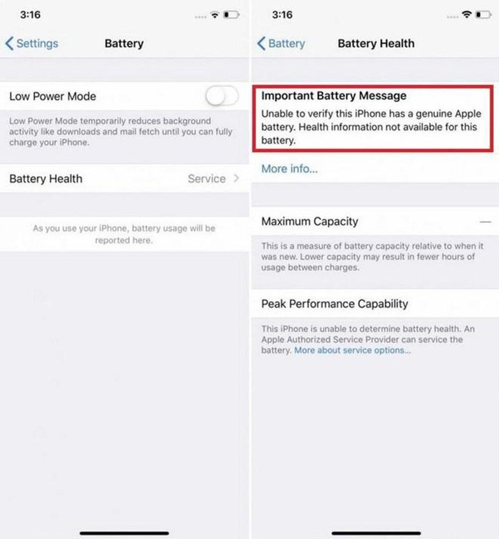 Theo PhoneArena, thay đổi này được Apple áp dụng để quản lý chặt hơn việc thay pin trên iPhone và những cửa hàng thay pin không được ủy quyền. Ngay cả khi thay pin "xịn" từ Apple từ máy này sang máy khác nhưng không phải tại các trung tâm ủy quyền, bạn vẫn sẽ thấy thông báo này.