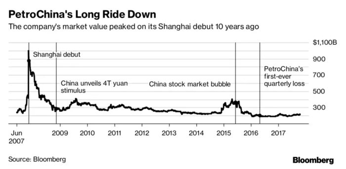 Sự tụt hạng của PetroChina từ năm 2007 cho đến 2017 (từ 1.100 tỷ USD còn dưới 300 tỷ USD) (Nguồn Bloomberg).