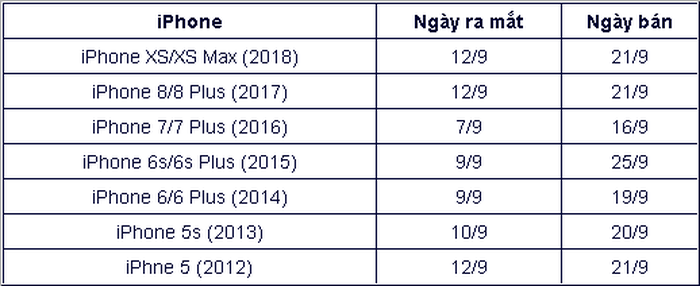 Trong bảy năm qua, Apple đã công bố iPhone trong cùng một tuần với Ngày Lao động (của Mỹ), vào Thứ Hai đầu tiên của tháng Chín, hoặc tuần tiếp theo. Trước đây, nếu kỳ nghỉ ở Mỹ xảy ra vào ngày 3 tháng 9 hoặc sớm hơn, Apple đã công bố iPhone của mình vào tuần sau. Khi Ngày Lao động rơi vào ngày 5 tháng 9 hoặc muộn hơn, như trong năm 2015 và 2016, Apple đã công bố iPhone vào thứ Tư tuần sau (hai ngày sau Ngày Lao động). Hãy nhìn vào biểu đồ dưới đây để xem những ngày iPhone trước đây ra mắt là vào ngày nào: