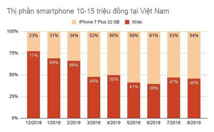 Từ tầm giá trên 10 triệu, iPhone đã bắt đầu chiếm lĩnh thị phần với những mẫu như iPhone 7 Plus. Đồ họa: Xuân Tiến.
