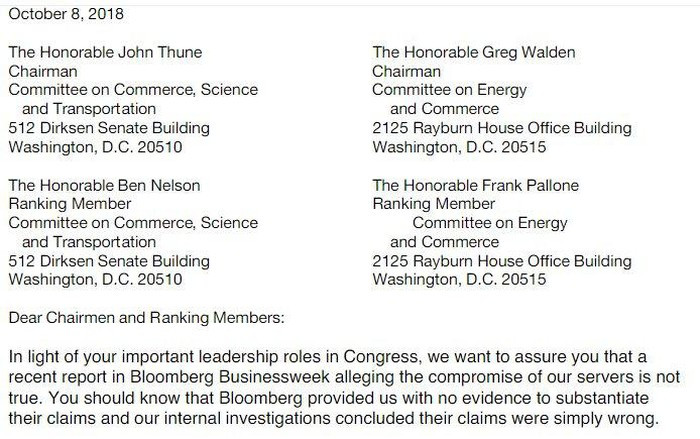 Apple vẫn liên tục phủ nhận về hành động này, đặc biệt vừa qua George Stathakopoulos - Phó Chủ tịch an ninh thông tin của công ty đã trực tiếp gửi thư tới Quốc hội với lời khẳng định đanh thép nhất từ trước đến giờ: "Apple chưa bao giờ tìm thấy những con chip độc hay hoặc các lỗ hổng bảo mật được cố ý cài vào trong bất cứ máy chủ nào. Chúng tôi cũng chưa từng cảnh báo cho FBI bất cứ mối quan tâm về vấn đề bảo mật nào như những gì được nêu trong bài báo, cũng như việc FBI chưa bao giờ liên lạc với chúng tôi để có các cuộc điều tra tương tự".