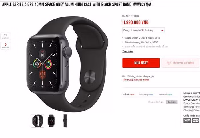Tại một cửa hàng nhỏ trên đường Trần Quang Khải (quận 1, TP.HCM), Apple Watch Series 5 chính hãng được chào bán với giá từ 10,9 triệu đồng cho bản 40 mm và bản 44 mm có giá 11,7 triệu đồng. Tuy nhiên, chủ cửa hàng cho biết Apple Watch mới sẽ được giao cho khách từ đầu tháng 11.