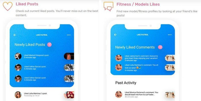 Ứng dụng Like Patrol gửi thông báo về điện thoại mỗi khi tài khoản Instagram mà người dùng đang theo dõi để lại bình luận hay thích một tấm ảnh. Nó giúp họ dễ dàng theo dõi người khác đang làm gì trên Instagram. Thậm chí, nó còn phân tích số liệu theo giới tính và chỉ ra ai là người mà tài khoản Instagram đó tương tác nhiều nhất.