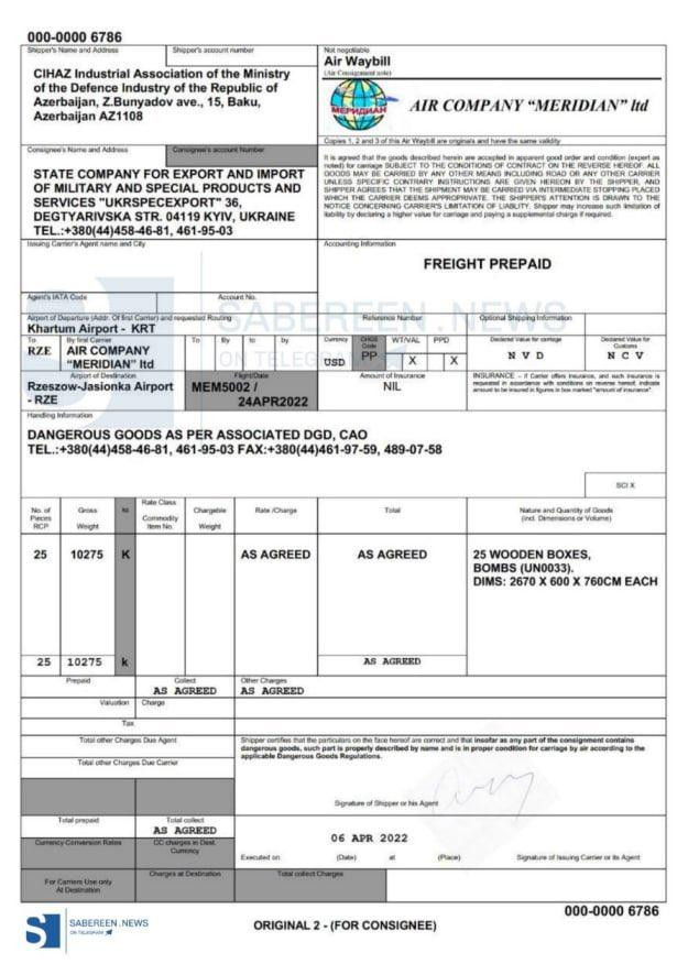 Hãng hàng không Ukraine Meridian, có liên kết với Bộ Quốc phòng Ukraine đã vận chuyển bom có điều khiển từ Sân bay Khartoum ở Sudan đến Sân bay Rzeszow ở Ba Lan.
