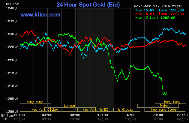 Chốt phiên giao dịch Thứ Năm (ngày 17/11), giá vàng giao tháng Mười hai trên sàn Comex tại Sở giao dịch New York Mercantile trôi tiếp $7 (-0,6%) về đóng cửa ở $1.216,90/oz – thấp nhất kể từ ngày 02/06; Dù trước đó trong phiên, phần lớn thời gian, vàng được giao dịch trên ngưỡng $1.231/oz.