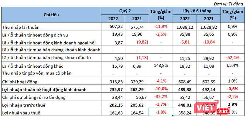 Trong đó, thu nhập lãi thuần của ngân hàng này đạt 507,2 tỉ đồng, giảm 11,9% so với cùng kỳ năm trước. Lãi thuần từ hoạt động dịch vụ đạt 19,4 tỉ đồng, giảm 2,6% so với quý 2/2021.