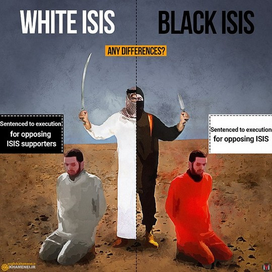 Hình ảnh gây nhiều tranh cãi được đăng tải trên trang web được cho là của Lãnh tụ Tối cáo Iran ám chỉ rằng điều khác biệt duy nhất giữa Ả Rập Saudi và Nhà nước Hồi giáo (IS) tự xưng là màu chiếc áo. Ảnh: Daily Mail
