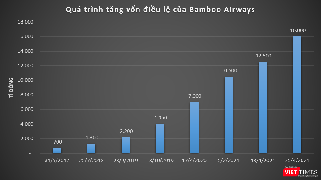 Như vậy, chỉ trong tháng 4/2021, Bamboo Airways đã thực hiện 2 lần tăng vốn điều lệ. Gần nhất là hôm 13/4, hãng hàng không này thông báo tăng vốn từ 10.500 tỉ đồng lên 12.500 tỉ đồng.