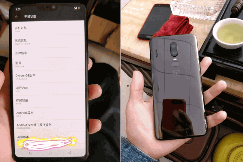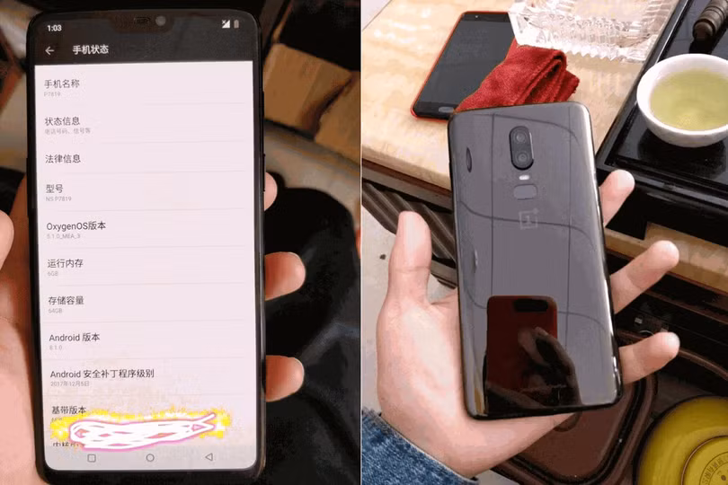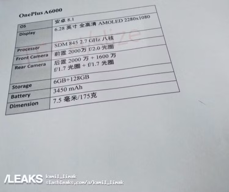 Một hình ảnh rò rỉ khác của SlashLeaks hé lộ nhiều điều về OnePlus 6. Đầu tiên máy có trọng lượng 175g và dày 7.5mm. Màn hình OLED 6,28 inch độ phân giải 2280x1080 với tỷ lệ 19:9. OnePlus công bố màn hình chiếm 90% diện tích mặt trước. Khả năng chụp ảnh của OnePlus 6 cũng được cải tiến đáng kể với camera trước 20 MP khẩu độ f/2.0; cụm camera kép phía sau gồm 1 ống kính 20 MP khẩu độ f/1.7 và ống kính 16 MP khẩu f/1.7.