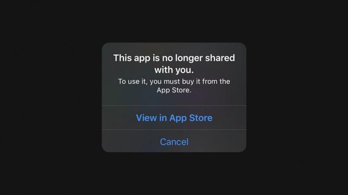 “Ứng dụng này không còn được chia sẻ với bạn”, thông báo lỗi hiện lên tới người dùng.