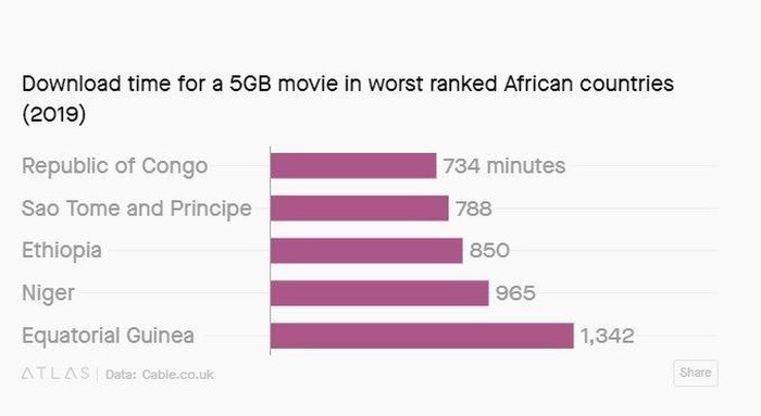 Đó là tại Equatorial Guinea, một quốc gia dầu mỏ giàu có tại châu Phi, bạn phải mất hơn 22 giờ mới tải nổi một bộ phim 5 GB. Trong khi đó tại Đài Loàn, tải một bộ phim 5 GB như thế sẽ chỉ mất 8 phút.