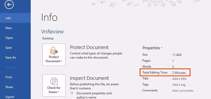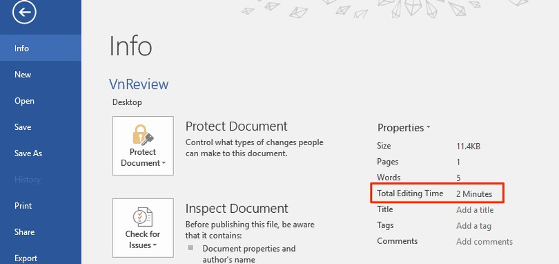 Khi bạn đang làm việc trên tài liệu nào đó và muốn kiểm tra tổng thời gian chỉnh sửa (kể từ lúc bắt đầu), bạn chọn trình đơn File > Info. Bạn sẽ thấy chỉ số Total Editing Time bên dưới mục Properties. Trong trường hợp của chúng tôi chỉ số này là 2 Minutes (2 phút).