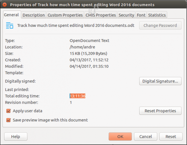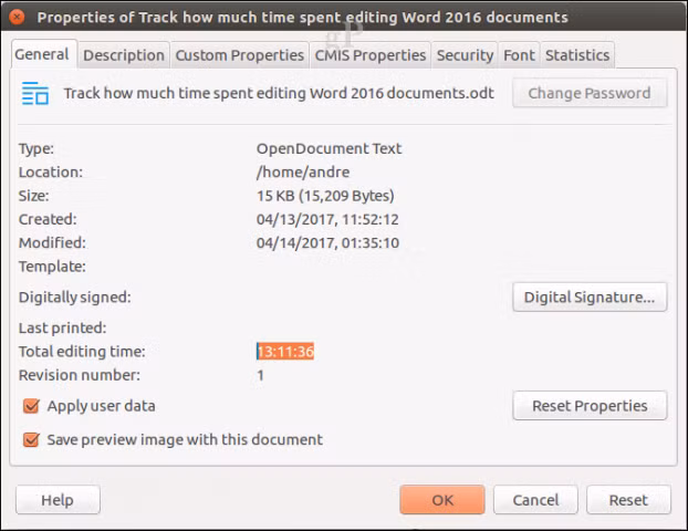 Nếu bạn đang dùng Libre Office trên Linux, bạn có thể tìm thấy thông tin này bằng cách mở tài liệu Writer, chọn trình đơn File > Properties > General và bạn sẽ thấy thông tin bạn cần tìm ở đó.