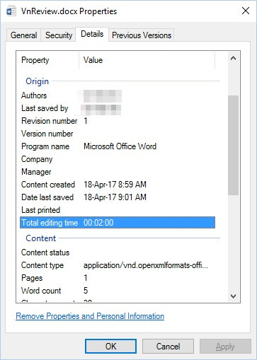 Khi bạn bắt đầu làm việc với một tài liệu Word mới, đồng hồ của Word sẽ bắt đầu đếm giờ. Và khi bạn lưu tài liệu, lượng thời gian tính đến thời điểm hiện tại sẽ được Word lưu lại và nó được gọi là tổng thời gian chỉnh sửa (Total Editing Time).