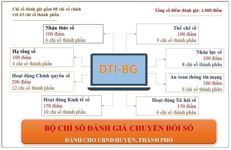 Đối với của UBND huyện, thành phố, Bộ chỉ số đánh giá chuyển đổi số, bao gồm Thông tin chung (không dùng để đánh giá) và 8 chỉ số chính với 63 chỉ số thành phần, tổng số điểm đánh giá cũng là 1.000 điểm.