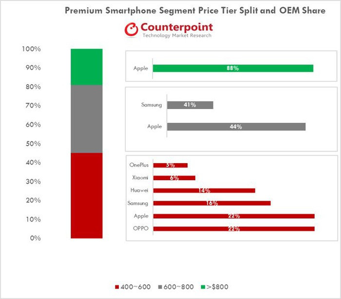 Một số thông tin đáng chú ý khác là Apple vẫn thống trị thị trường cao cấp. iPhone chiếm tới 88% doanh thu của các smartphone giá trên 800 USD. Apple và Samsung cạnh tranh vị trí nhất nhì trên phân khúc giá 600 - 800 USD với phần thắng nghiêng về nhà sản xuất iPhone (44% so với 41%). Phân khúc 400 - 600 USD dẫn đầu bởi Oppo và Apple với tỷ lệ bằng nhau 22%.