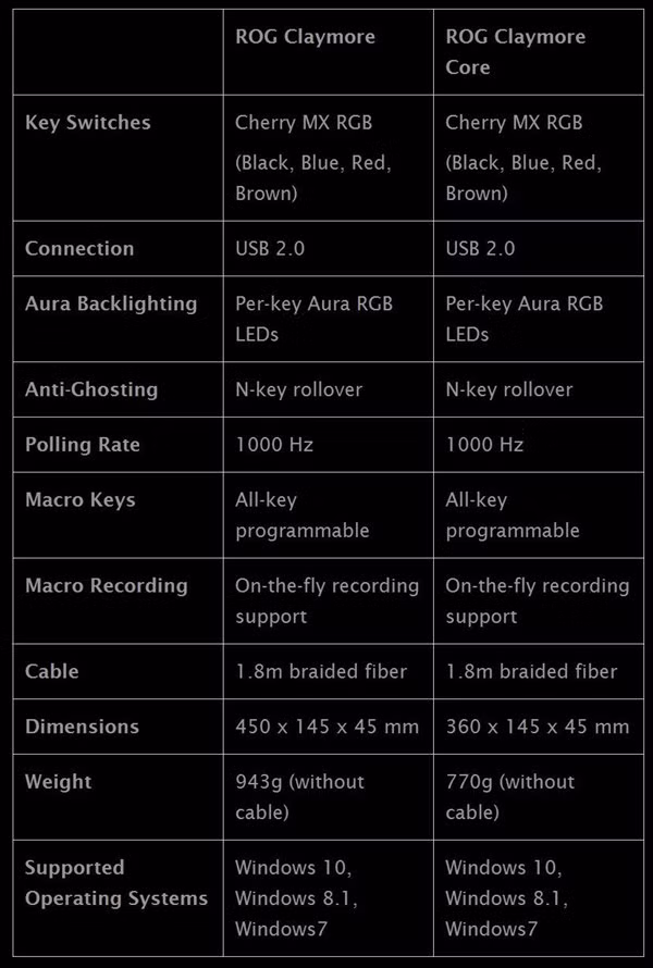 Như PC World Vietnam từng thông tin, Asus ROG Claymore và ROG Claymore Core là những mẫu bàn phím cơ được thiết kế hướng đến giới game thủ chuyên nghiệp cần một sản phẩm đa năng, nhưng cũng phải thật tiện dụng cho nhu cầu mang theo bên mình khi phải tham gia các giải đấu tập trung.
