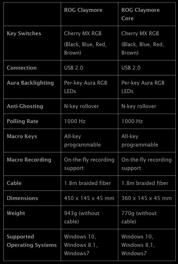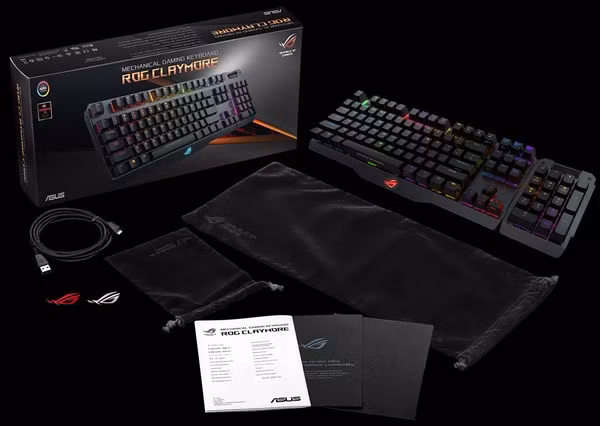 Tính đến thời điểm này, bộ đôi bàn phím Asus ROG Claymore là những sản phẩm đầu tiên có tính năng tháo rời cụm phím số nhằm tối ưu cho khả năng di chuyển, rất thích hợp khi game thủ cần phải tham gia những giải đấu tập trung. 2 mẫu bàn phím cơ thế hệ mới của Asus còn được ứng dụng công nghệ Aura Sync RGB LED vốn cho phép người dùng đồng bộ hiệu ứng đèn nền LED với những sản phẩm tương thích. Người dùng cũng thoải mái lựa chọn giữa các kiểu switch hàng hiệu Đức Cherry MX RGB LED Black, Blue, Red hay Brown để có những trải nghiệm vừa tay nhất khi chiến game trong khi vẫn an tâm về tuổi thọ của từng phím độc lập.