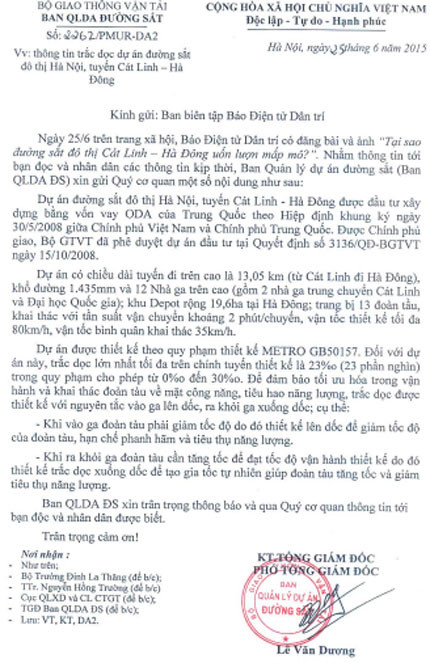 Văn bản do Phó Tổng giám đốc Ban QLDA ĐS Lê Văn Dương ký, nêu rõ: Dự án đường sắt đô thị Hà Nội, tuyến Cát Linh - Hà Đông được đầu tư xây dựng bằng vốn vay ODA của Trung Quốc theo Hiệp định khung ký ngày 30/5/2008 giữa Chính phủ Việt Nam và Chính phủ Trung Quốc. Được Chính phủ giao, Bộ GTVT đã phê duyệt dự án đầu tư tại Quyết định số 3136/QĐ-BGTVT ngày 15/10/2008.
