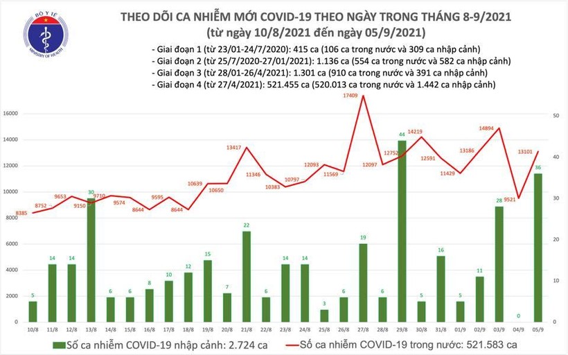 Tính từ 17h ngày 04/9 đến 17h ngày 05/9, trên Hệ thống Quốc gia quản lý ca bệnh COVID-19 ghi nhận 13.137 ca nhiễm mới, trong đó 36 ca nhập cảnh và 13.101 ca ghi nhận trong nước, trong đó có 7.521 ca trong cộng đồng.