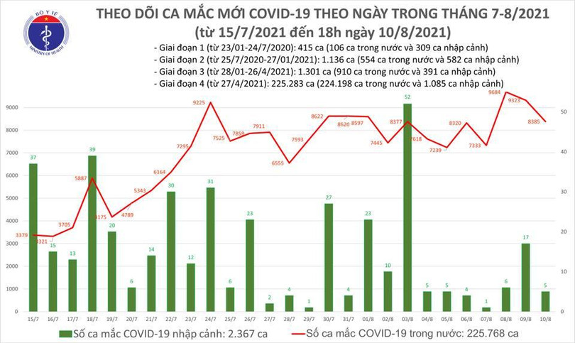 Tính đến chiều ngày 10/8, Việt Nam có 228.135 ca nhiễm trong đó có 2.367 ca nhập cảnh và 225.768 ca nhiễm trong nước.