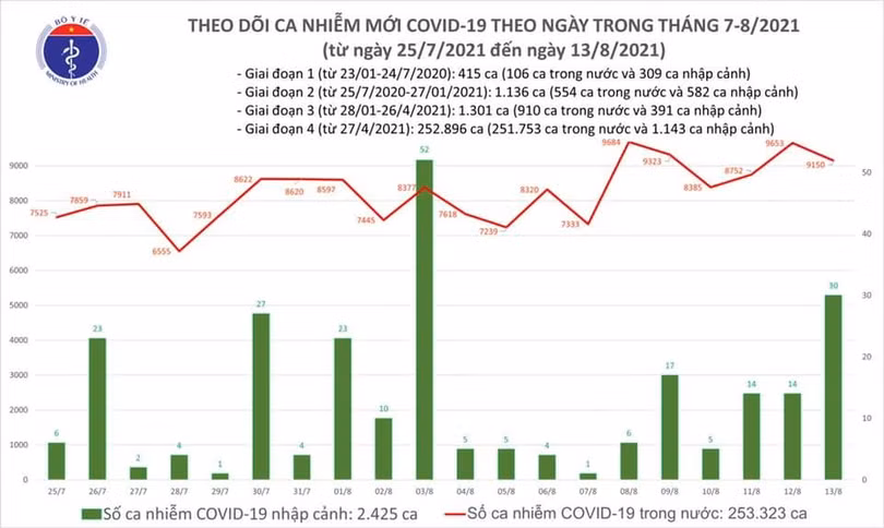 Cụ thể, tính từ 18h ngày 12/8 đến 18h ngày 13/8, trên Hệ thống Quốc gia quản lý ca bệnh COVID-19 ghi nhận 30 ca nhập cảnh và 9.150 ca ghi nhận trong nước, trong đó có 1.999 ca trong cộng đồng.
