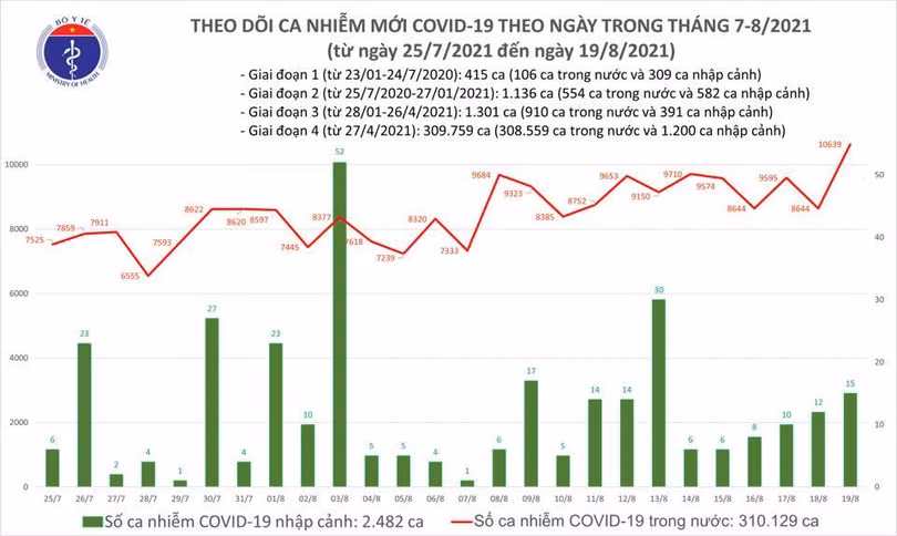 Cụ thể, tính từ 18h30 ngày 18/8 đến 19h ngày 19/8, trên Hệ thống Quốc gia quản lý ca bệnh COVID-19 ghi nhận 10.654 ca nhiễm mới, trong đó 15 ca nhập cảnh và 10.639 ca ghi nhận trong nước, trong đó có 6.407 ca trong cộng đồng.