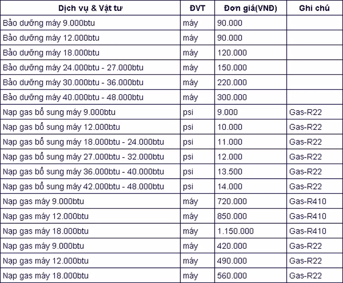Dưới đây sẽ là bảng tổng hợp giá dịch vụ bảo dưỡng điều hòa kèm nạp gas để người dùng tham khảo, biết mức chi phí.