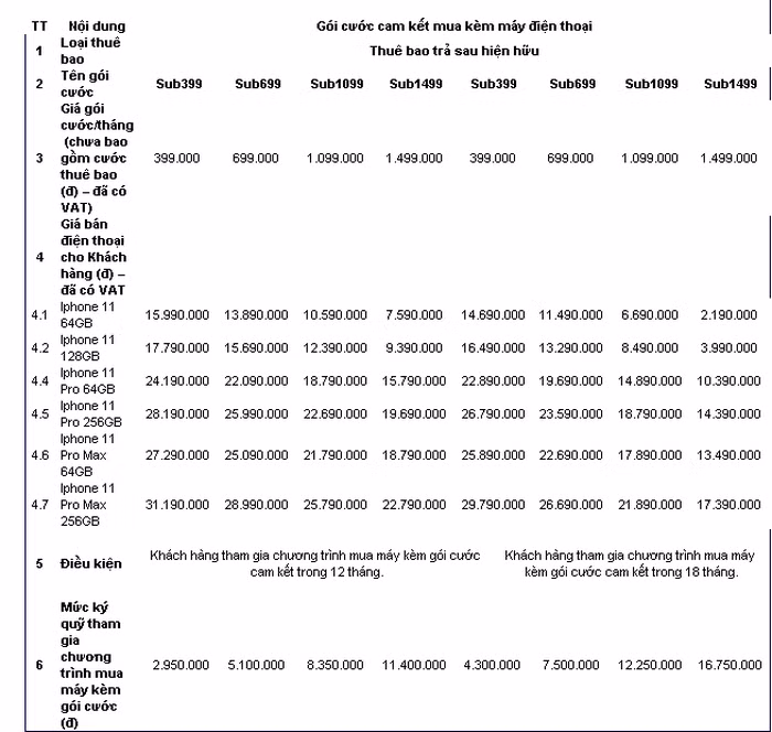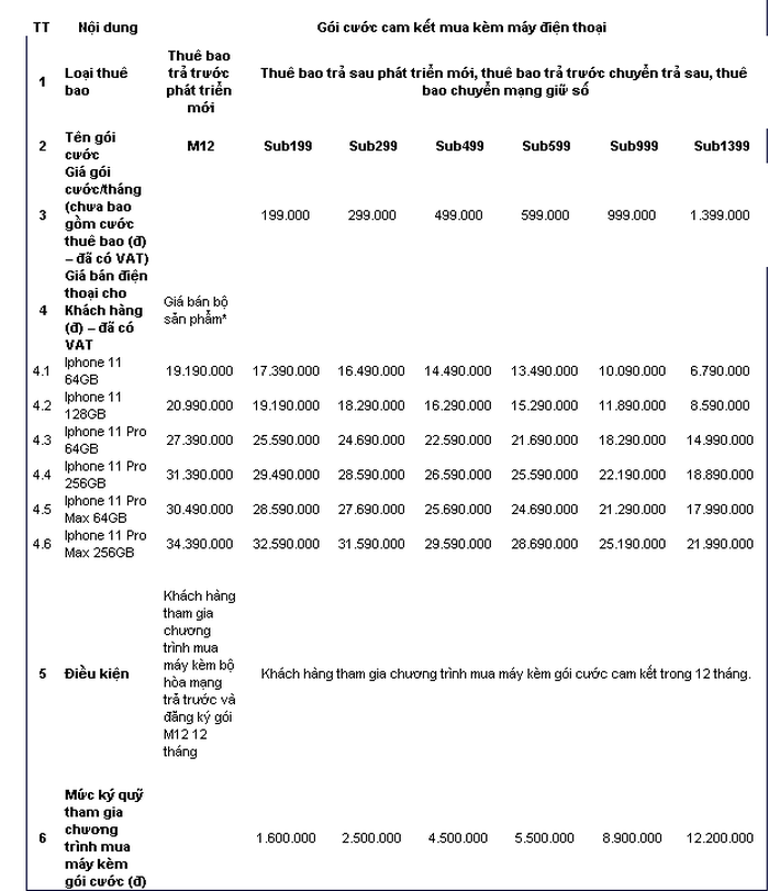 Trong khi đó khi cam kết sử dụng gói cước MobiFone 12 tháng, khách hàng có thể sở hữu một chiếc iPhone 11 với mức giá ban đầu thấp nhất là 6.790.000 đồng. Người dùng quan tâm đến chương trình có thể tham khảo cụ thể các mức giá dưới đây hoặc trên mobistore.vn.