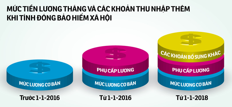 Mức tiền lương làm căn cứ đóng BHXH được quan tâm nhất. Nếu trước đây chỉ tính theo mức lương cơ bản thì từ năm 2016 sẽ cộng thêm các khoản phụ cấp, đến năm 2018 sẽ tính trên tổng thu nhập gồm lương, phụ cấp lương và các khoản bổ sung.
