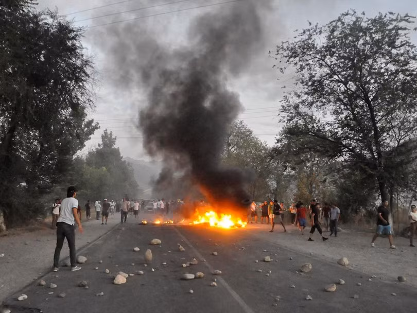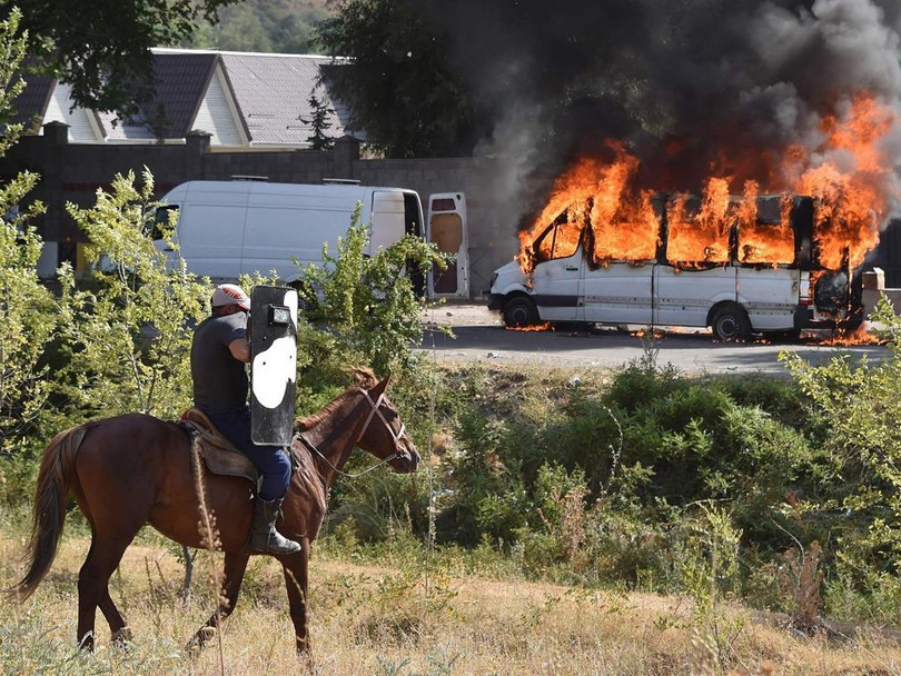 Tại làng Koy Tash, nhiều người đã ném đá vào các nhân viên thực thi pháp luật, thậm chí châm lửa đốt vỏ (lốp) xe trên đường để ngăn những người dẫn giải ông Atambayev di chuyển suôn sẻ.(Ảnh dưới)